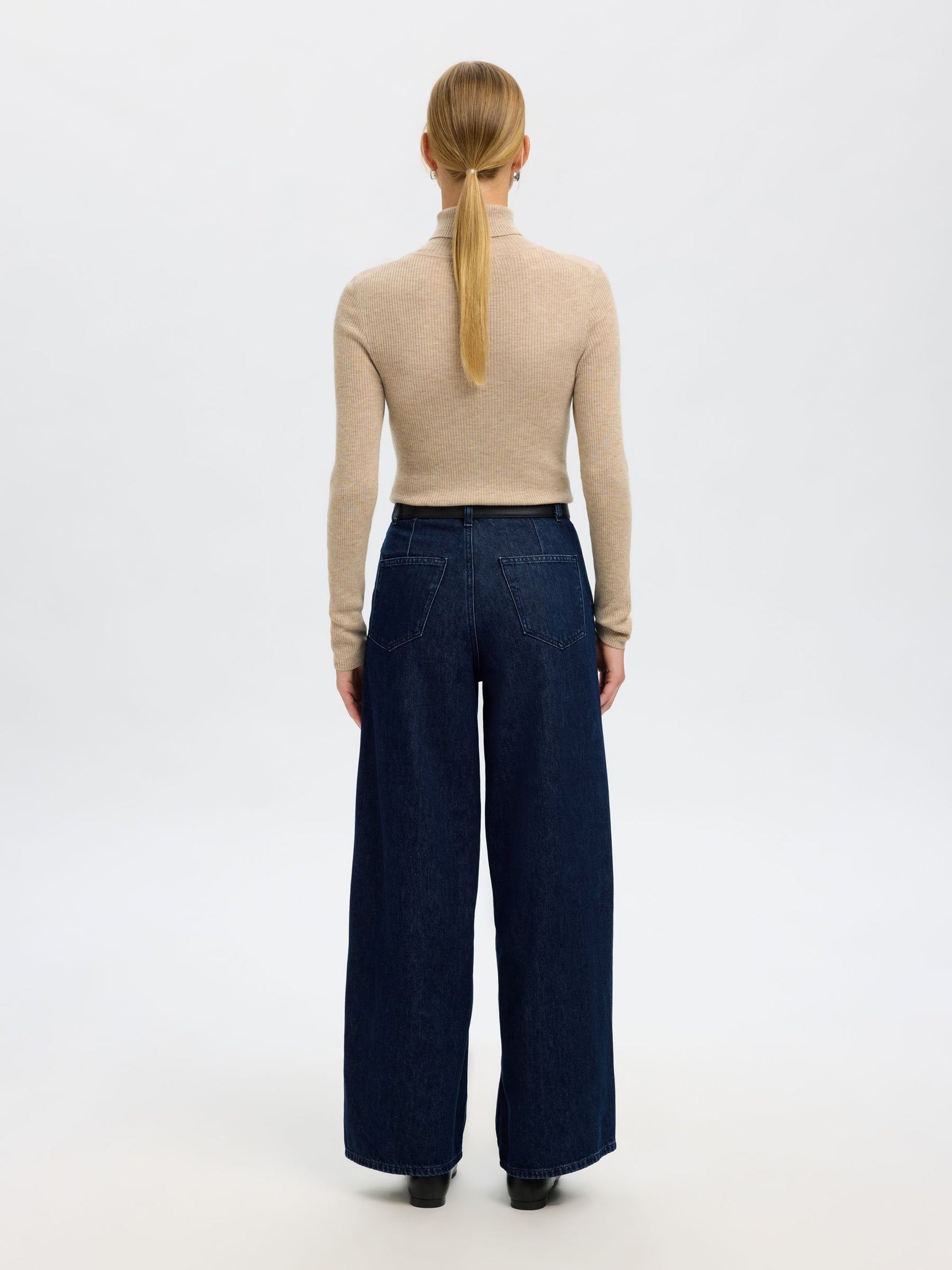 Mooie wide leg jeans van het merk Selected. Deze jeans heeft een donkere wassing, knoop- en ritssluiting, 2 steekzakken en 2 achterzakken. De jeans valt hoog in de taille. De jeans valt iets kleiner.
