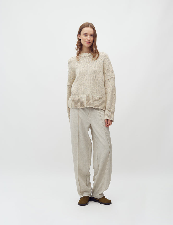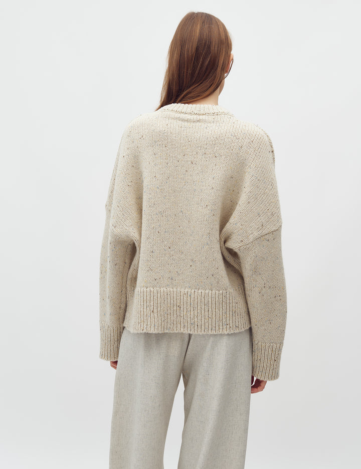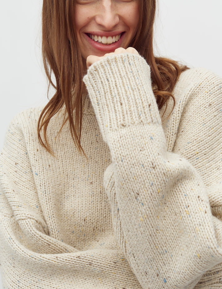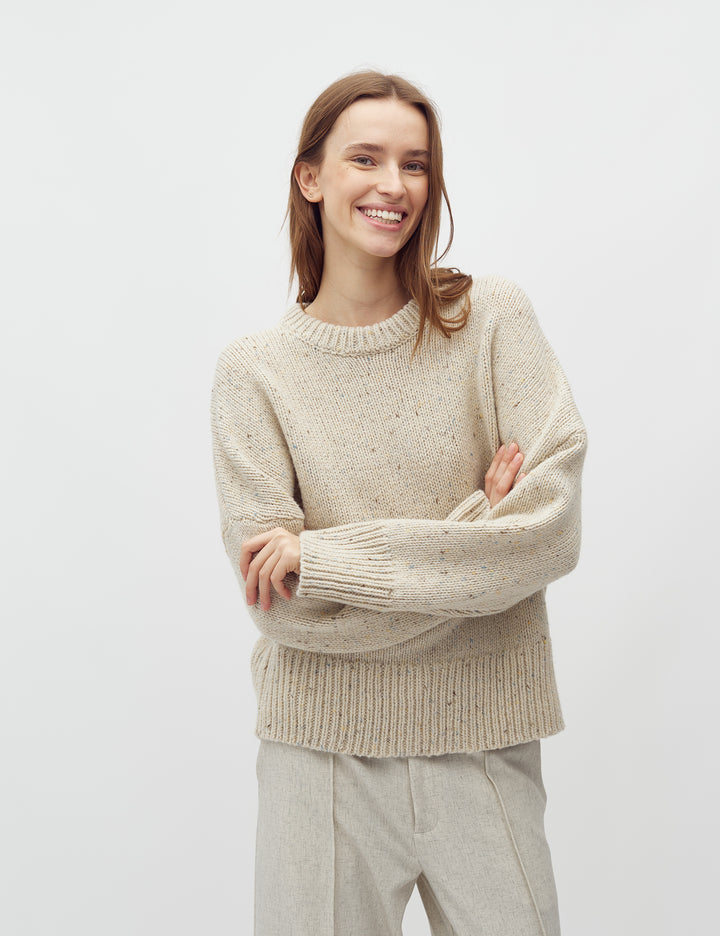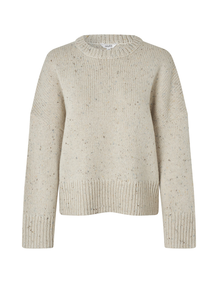 Heerlijke knit van MbyM in de kleur Oyster sprinkle. De trui heeft een spikkel van diverse kleuren, lage mouwinzet, rond boord en boord aan de mouwen. De fit is oversized.