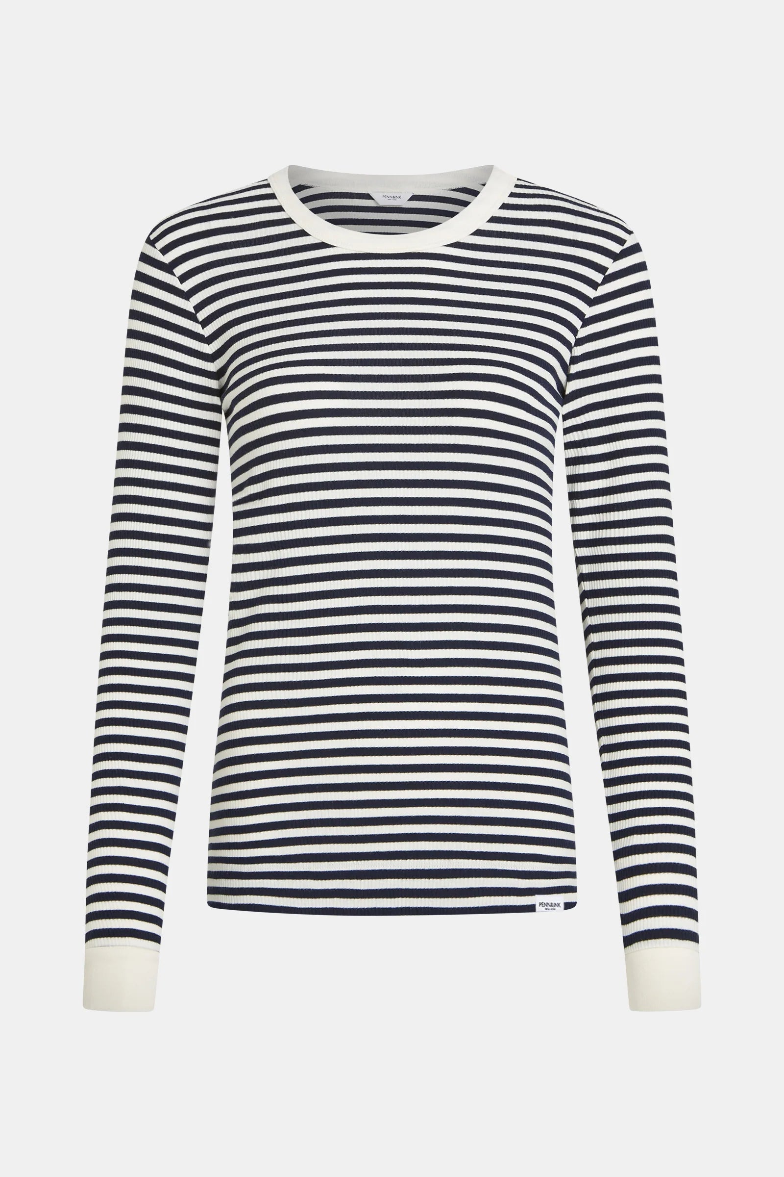 Fijne rib longsleeve van het merk Penn & Ink in de kleuren navy-ecru. De boorden zijn mooi aangesloten in een effen ecru stof.